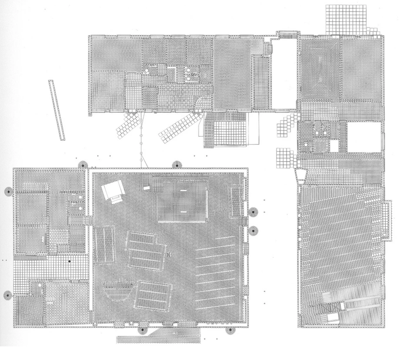 In terms of directionality and dynamics, the ceiling vaults run west-east towards the altar to emphasize a processional direction. At the same time, they rise from each side to a north-south pitching ridge above the column assembly. The combined effect is to stretch the west-east dimension and to gather, centralise and raise the space upward. This tension between two tendencies holds the space in suspense, in an indiscernible state somewhere between stability and dissolution. In the brick floor the bed joints run north-south, but at an angle to the square plan. Within this linear pattern Lewerentz inserts several areas of paving at other angles—like rugs or patches set within a larger web. Only the paving in the zone of the altar conforms to the orientation of the walls. Despite reading more like a woven multidirectional surface than a linear array, the heterogenous patterning of the floor counters the orthogonal alignment of the overall space and the altar, as well as the walls. The directionality of the paving resists and decelerates that of the vaults. These contrasting shifts in pattern and geometry create disjunctions and incommensurabilities in the spatial order of the room.